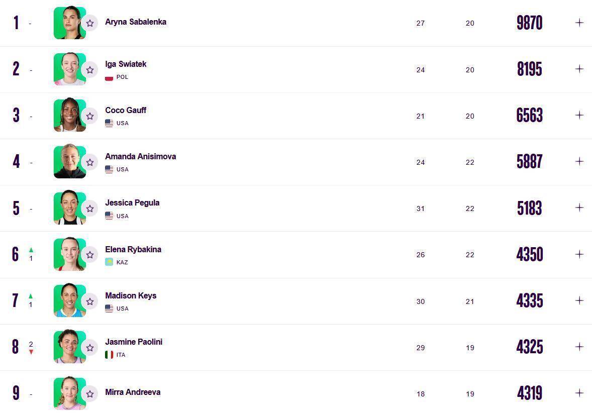 WTA顶尖集团的格局相对稳定。 萨巴伦卡、斯瓦泰克、高芙依然占据前三把交椅。 值得注意的是,莱巴金娜的排名上升至第6位,这位“亚洲一姐”在东京站获得了最后一张总决赛门票后选择了退赛,这一决定引发了不少讨论。