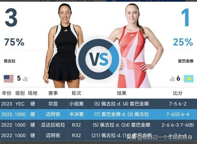 接下来,莱巴金娜的半决赛对手佩古拉,同样不容小觑。佩古拉不仅是网坛著名的“富家女”,她的球技也是稳如老狗,被称为“稳定女王”。她所在的小组同样有着萨巴伦卡和高芙等强手,赛程也充满了挑战。尽管她在小组赛中输给了萨巴伦卡,但最终凭借2胜1负的成绩顺利晋级。而且,两人此前的4次交手,佩古拉以3胜1负占据优势,因此赛前不少人认为,凭借佩古拉的稳定性,她有很大可能获胜。