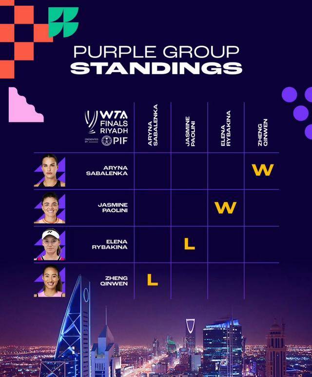 郑钦文所在的紫组也完成了首轮对决。萨巴伦卡以6-3、6-4战胜了郑钦文,鲍里妮以7-6(5)、6-4战胜了莱巴金娜。接下来的第二轮比赛,郑钦文将对阵莱巴金娜,鲍里妮则与萨巴伦卡交锋。根据出线形势,若郑钦文与萨巴伦卡都获胜,萨巴伦卡将以小组第一身份出线,而郑钦文与鲍里妮将在周三争夺小组第二。如果萨巴伦卡两盘胜出,而莱巴金娜三盘取胜,萨巴伦卡依然会出线,名次待定。如果鲍里妮和莱巴金娜获胜,鲍里妮将作为小组第一晋级,郑钦文将被淘汰,莱巴金娜与萨巴伦卡将在周三争夺第二名。而如果鲍里妮两盘获胜,郑钦文则需三盘胜出,才有可能出线。