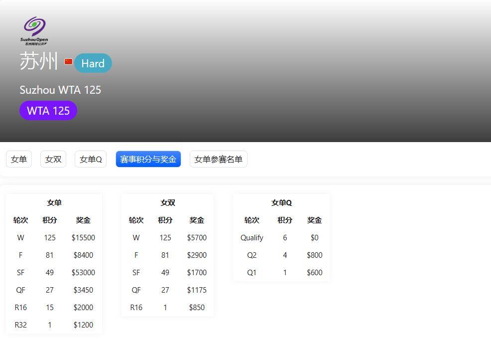 接下来说说苏州125赛。这场赛事的冠军将获得15500美元奖金,折合人民币大约11万元,同时还有125个积分奖励。而决赛亚军也能得到81个积分,并收获8400美元奖金,约合人民币6万元。由于本周是中网的第二周,许多在中网被淘汰的球员也纷纷参赛,因此,赛事的竞争十分激烈。前四种子选手包括伊约维奇、玛利亚、拉门斯和伊埃拉。此外,京山赛冠军孙璐璐也参与了此站比赛,其他实力选手如普汀塞娃、戈鲁比奇和布隆泽蒂等也都参与其中,比赛的质量和竞争程度可见一斑。