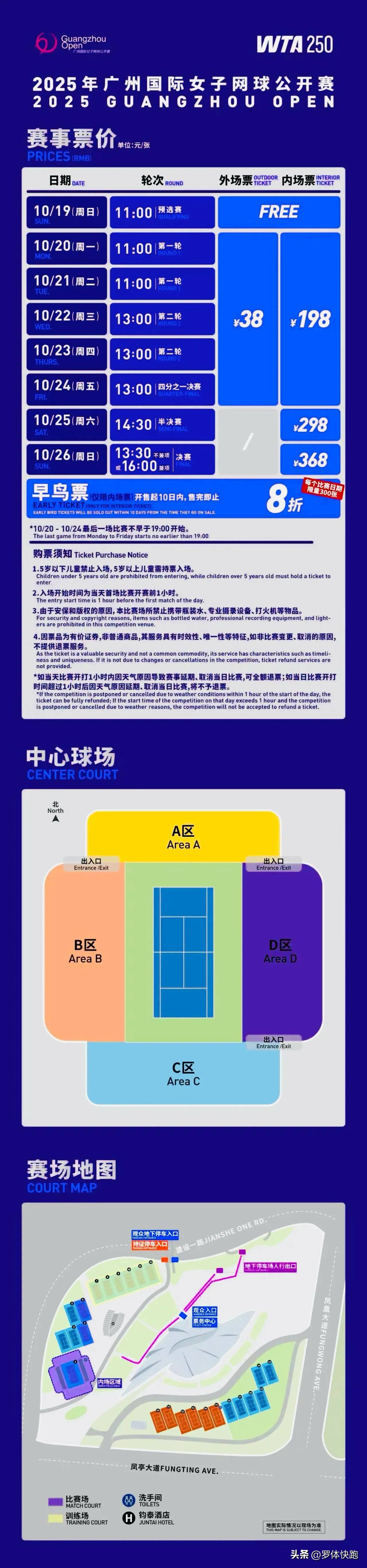 本届WTA250广州网球公开赛的单打资格赛定于10月19日和10月20日展开,正赛自10月20日拉开帷幕,半决赛将在10月25日进行,单打与双打的决赛以及颁奖仪式则安排在10月26日。值得关注的是,10月19日的资格赛首轮对公众免费开放,观众可在检票处领取手环后进场观赛。此外,广网还新增外场票,10月20日至24日每日仅需38元即可观赏除中心场以外的所有场地赛事与球员训练,是与球星近距离互动、获取签名和合影的极佳机会,诚邀广大球迷前来体验。