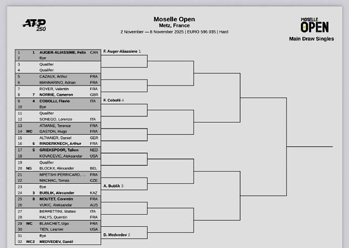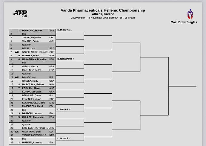 我们再来关注下周赛事。北京时间昨晚,下周的两站ATP250室内硬地赛公布了正赛签表。雅典站:德约科维奇、穆塞蒂、达尔德里、中岛-布兰登领衔出战;梅兹站:阿利亚西姆、梅德维德夫、布勃里克、科博利位列前四种子。需要说明的是,雅典站由原贝尔格莱德站迁址更名而来,原因是ATP运营标准限制及德约科维奇已定居雅典,而且赛事总监是德约科维奇的弟弟乔尔杰。