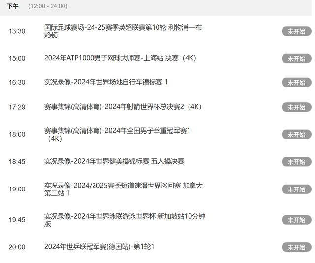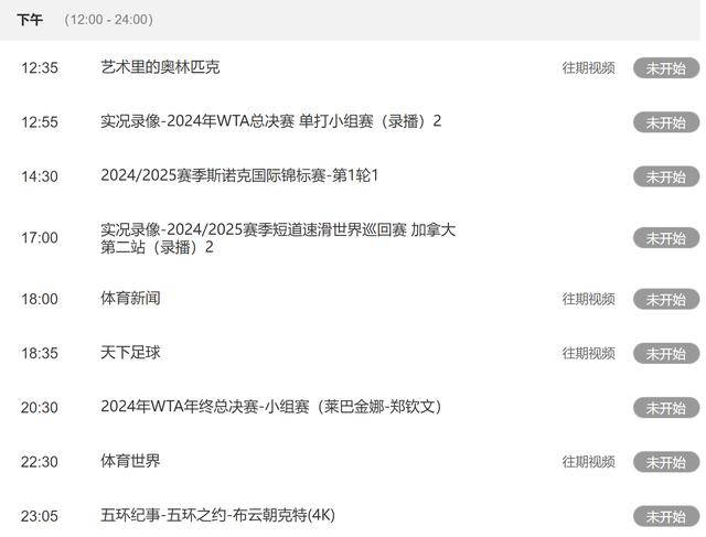当天,央视5台将在下午直播斯诺克比赛现场,并接着播放短道速滑的录像赛事。随后,在晚上八点半,将全程直播郑钦文对阵莱巴金娜的WTA年终总决赛小组赛。