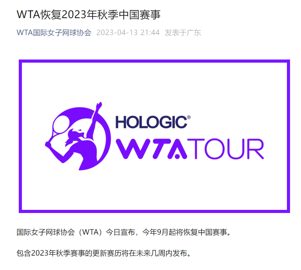 今年9月起将恢复中国赛事,包含2023年秋季赛事的更新赛历将于未来几周发布。