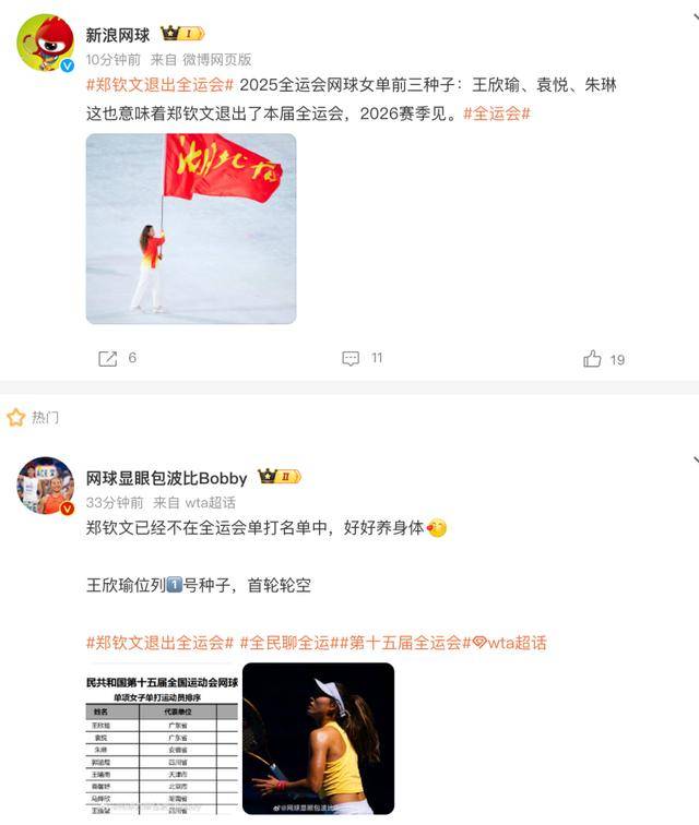 WTA巡回赛,女子网球,WTA排名,WTA赛程,女单四大满贯,女子网球直播/聚焦2025 WTA女子网球巡回赛,涵盖四大满贯、WTA1000/500/250赛事的赛程、排名、战报及竞猜推荐,为中文网球爱好者带来一站式资讯导航。北京时间11月12日,中国网球一姐郑钦文在此前开幕式出任湖北代表队的旗手后,如今根据多家媒体报道,郑钦文已经退出全运会女单比赛,王欣瑜递补成为女单1号种子。郑钦文下半年连续因伤退出多站赛事,如今在全运会退赛并不令人意外。
