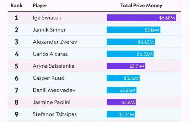 斯瓦泰克位居榜首,凭借上半年的出色表现,她累计获得了668万美元的奖金,领先排名第二的男子球员辛纳达152万美元之多。