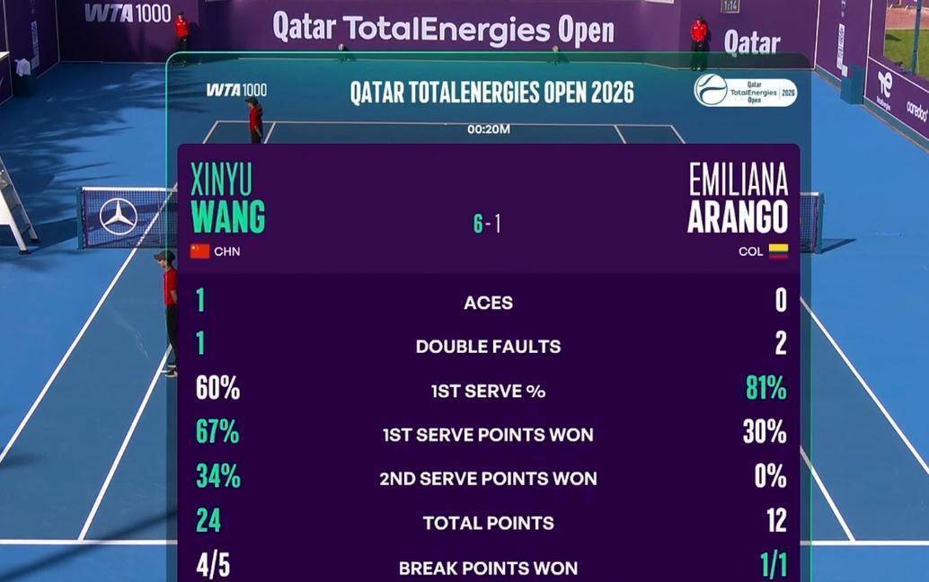 王欣瑜的比赛被安排在2月9日进行。 她的对手是世界排名第49位的哥伦比亚00后球员阿朗戈。 比赛进程在第一盘呈现出一边倒的局面。