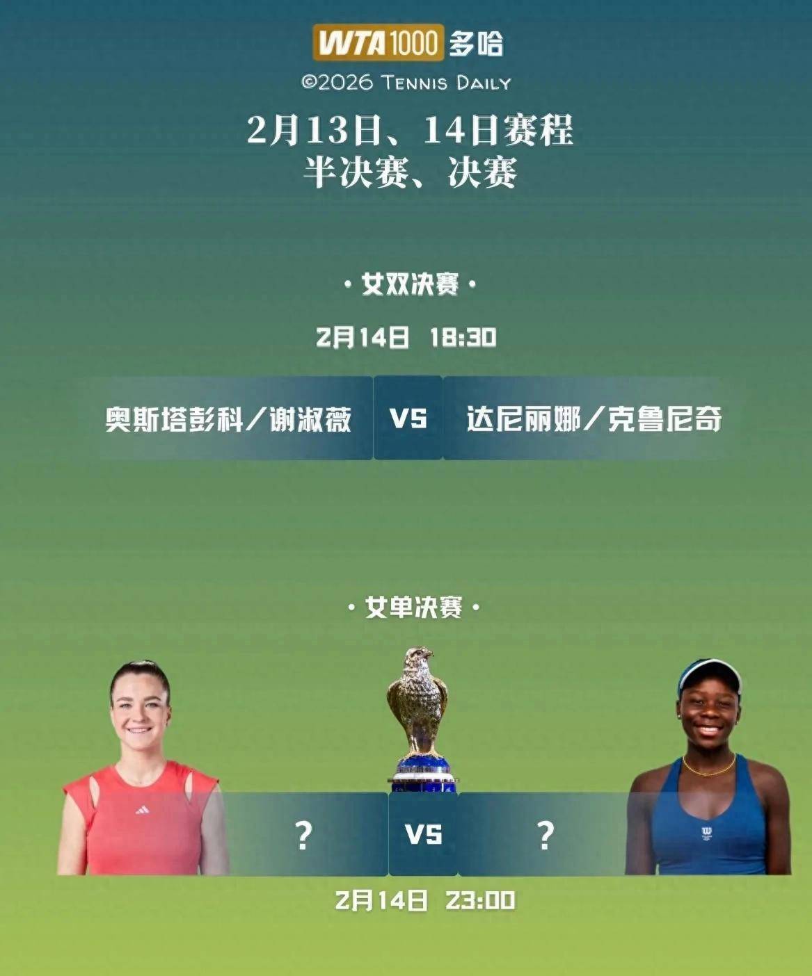 WTA巡回赛,女子网球,WTA排名,WTA赛程,女单四大满贯,女子网球直播/聚焦2025 WTA女子网球巡回赛,涵盖四大满贯、WTA1000/500/250赛事的赛程、排名、战报及竞猜推荐,为中文网球爱好者带来一站式资讯导航。谁能想到,WTA1000多哈站的决赛舞台,竟然看不到一位世界前八的身影? 这剧本,连最资深的网球迷也得直呼“没想到”。 2026年2月14日至15日,这个网球周末注定被载入史册。 多哈、鹿特丹、达拉斯,三站高级别巡回赛同时迎来收官之战,冠军即将全部揭晓。