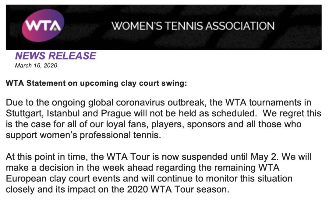 WTA巡回赛,女子网球,WTA排名,WTA赛程,女单四大满贯,女子网球直播/聚焦2025 WTA女子网球巡回赛,涵盖四大满贯、WTA1000/500/250赛事的赛程、排名、战报及竞猜推荐,为中文网球爱好者带来一站式资讯导航。wta在北京时间三月十六日宣布,由于受到新冠肺炎的影响,原定于在斯图加特、伊斯坦布尔和布拉格举行的WTA巡回赛将无法如期举行,wta将在五月二号之前不进行任何比赛。
